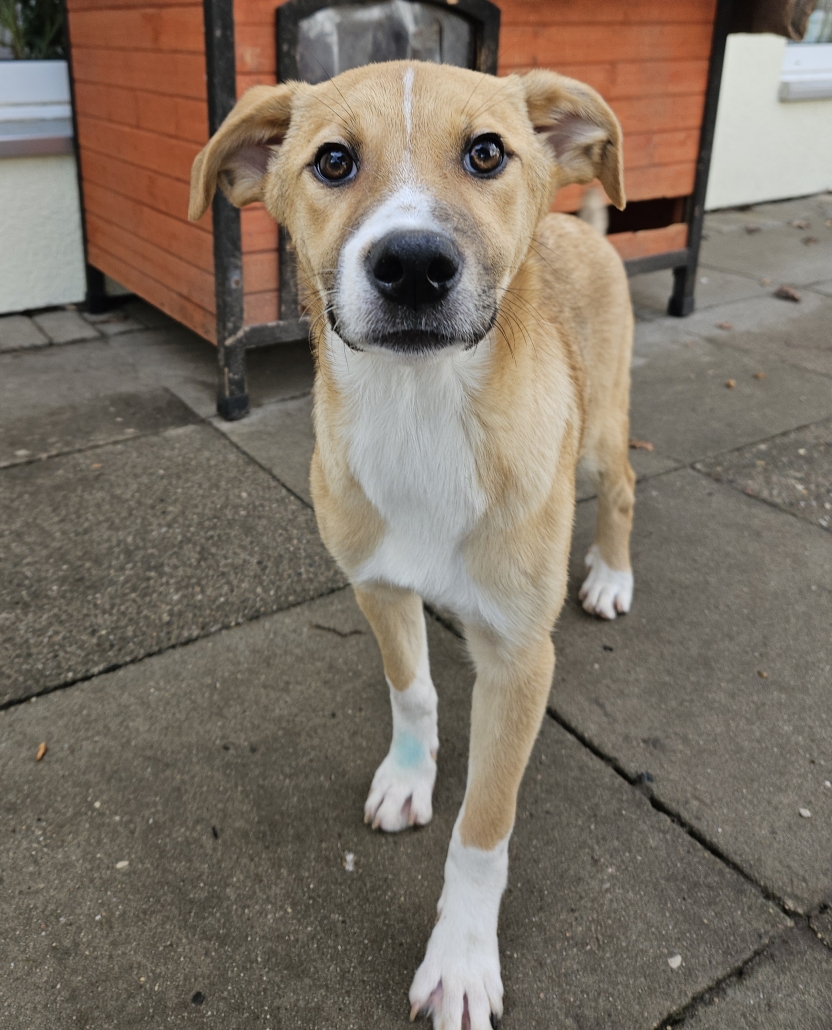 Bacardi (geb. 19.11.2025) ist eine aufgeweckte, braun-weiße Mischlingshündin. Sie geht offen auf Menschen zu, ist neugierig und voller Lebensfreude. Bacardi möchte lernen, erleben und gefallen – eine kleine Entdeckerin, die noch Anleitung braucht, aber mit Begeisterung dabei ist.