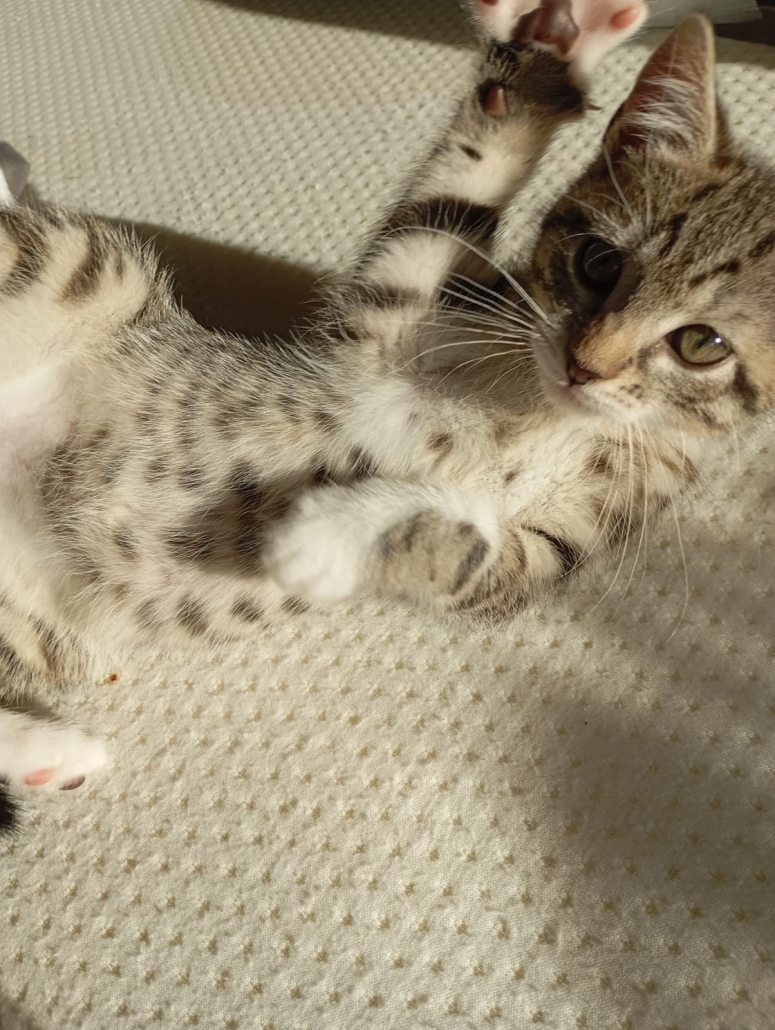 …ich bin Miro,der kleinste von uns dreien. Ich bin noch etwas zurückhaltend, verpasse gerne mal eine Spielzeit und schlafe lieber weiter. Appetit habe ich aber genauso großen wie meine Geschwister. Ich bin entwurmt, geimpft und gechipt. Wir alle sind schon stubenrein. Vielleicht hast Du ja sogar Platz für uns alle drei…das wäre mega…