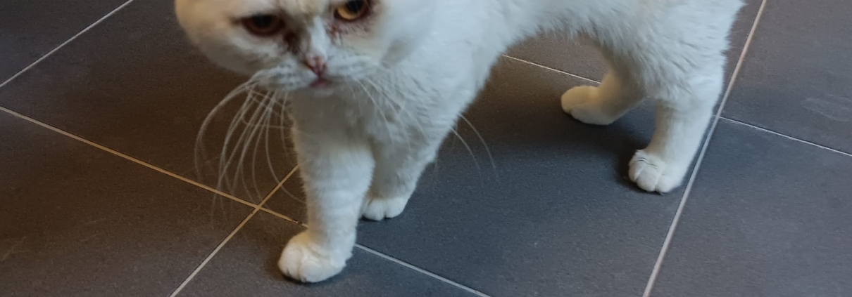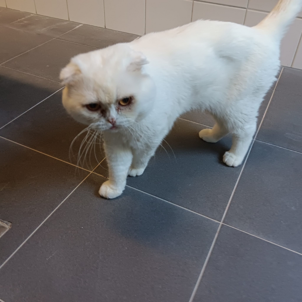 Am 14.10.2025 wurde dieser junge, unkastrierte Scottish Fold-Kater am Bahnhof in Peine gefunden und ins Tierheim Peine gebracht.