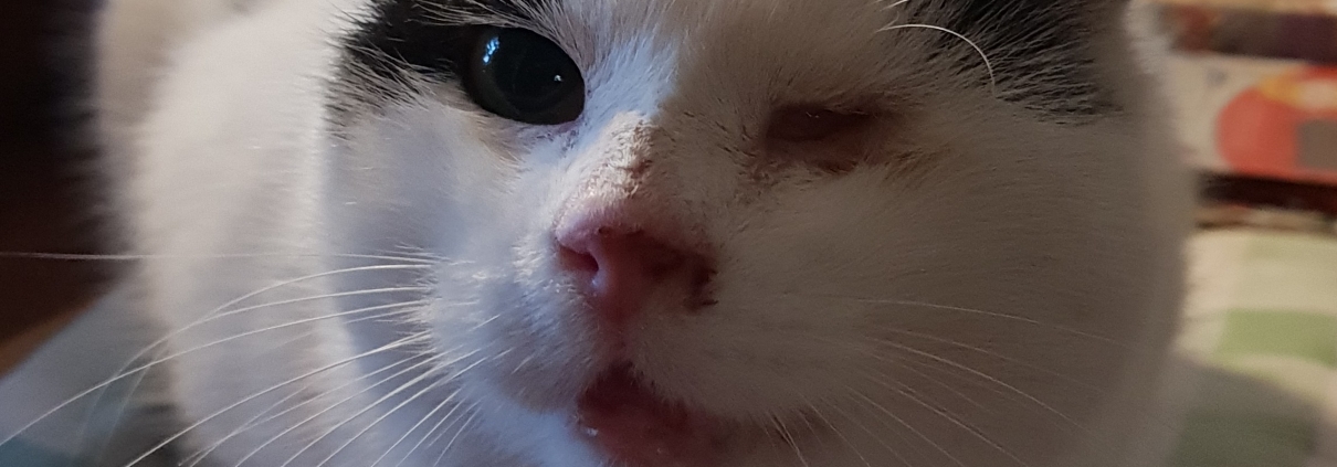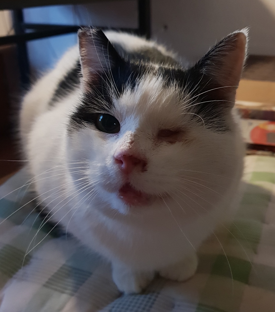 Kater Streuni wurde seit ca. 2,5 Jahren an der Futterstelle in Mehrum gesichtet. Einfangversuche sind bis letztes Jahr November immer gescheitert. Dann wurde der kleine Mann endlich gesichert, kastriert und das fehlende Auge sowie andere Verletzungen behandelt. Diese stammen wahrscheinlich aus einem Unfall oder Mißhandlung. dabei wurde der Kiefer höchstwahrscheinlich gebrochen und auch die Nebenhöhlen verschoben. Streuni braucht regelmäßige Behandlung und Säuberung des Auges. Durch die Fehlstellung des Kiefers kann er auch nur weiches Naßfutter fressen und bekommt sein Mäulchen nicht mehr ganz zu. Anfangs sehr scheu, hat sich an der Futterstelle gut eingelebt, ist sehr sozial mit den anderen Katzen und kommt jetzt im Winter sogar ins Haus wenn alle schlafen.