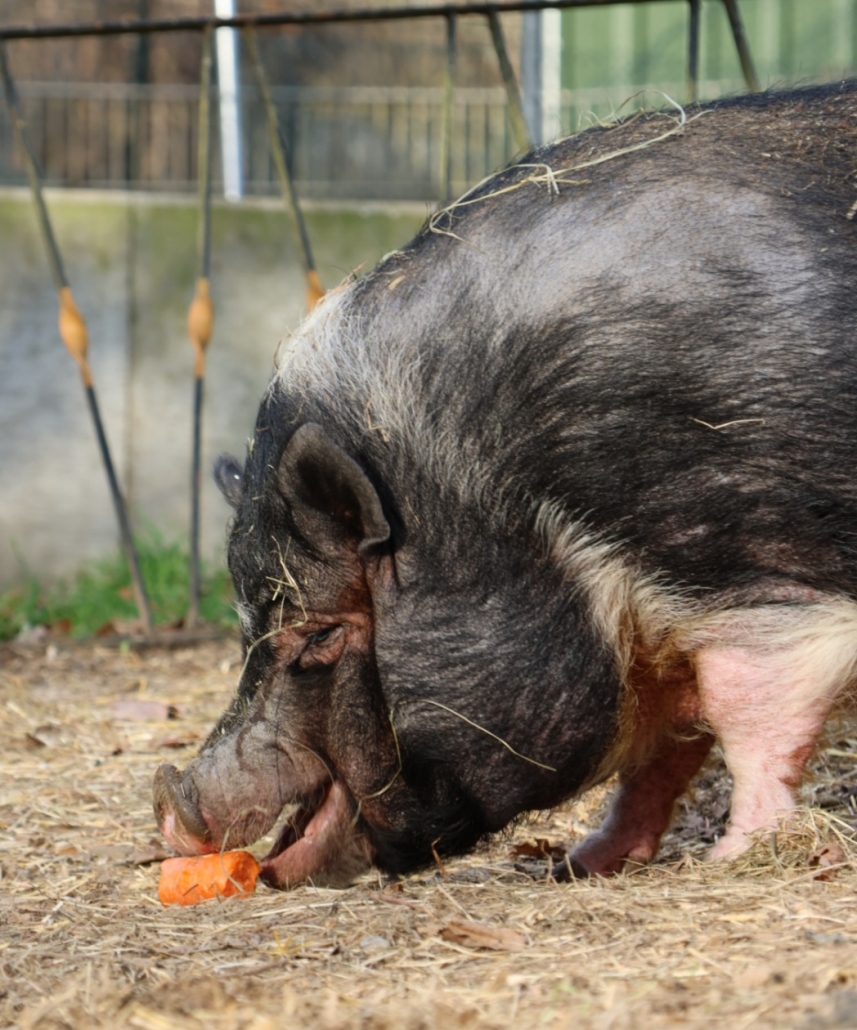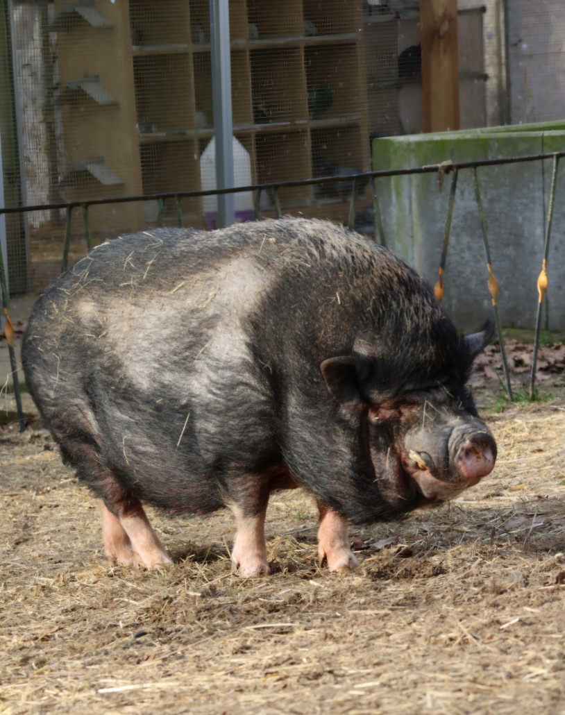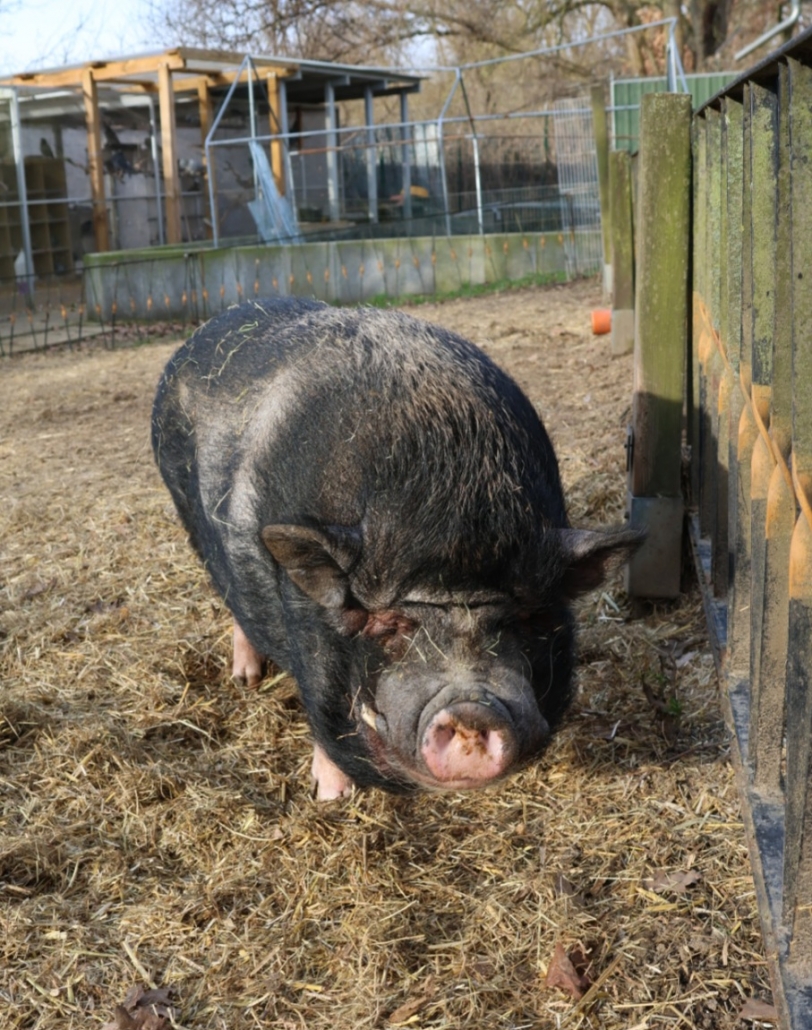 Er ist ein kastrierter, schwarzer Minipig-Eber, der 2015 geboren wurde. Piggeldy sucht ein Zuhause, in dem er liebevolle Gesellschaft findet und ausreichend Platz zum Spielen und Grasen hat. Schweine sind sehr soziale Tiere, daher wäre er besonders glücklich, wenn er nicht allein, sondern mit einem oder mehreren Artgenossen leben darf.
