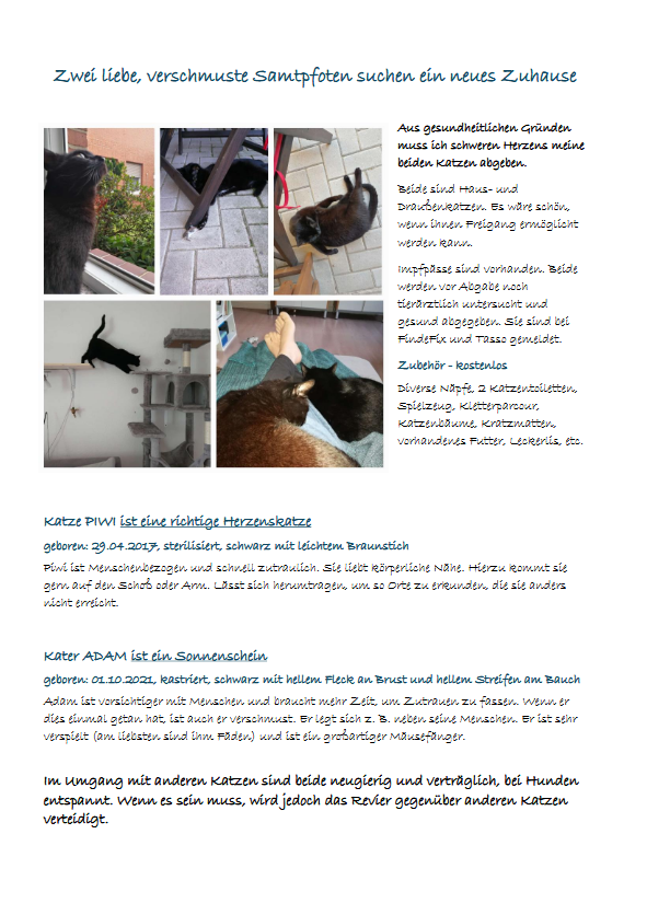 Aus gesundheitlichen Gründen muss ich schweren Herzens meine beiden Katzen abgeben.